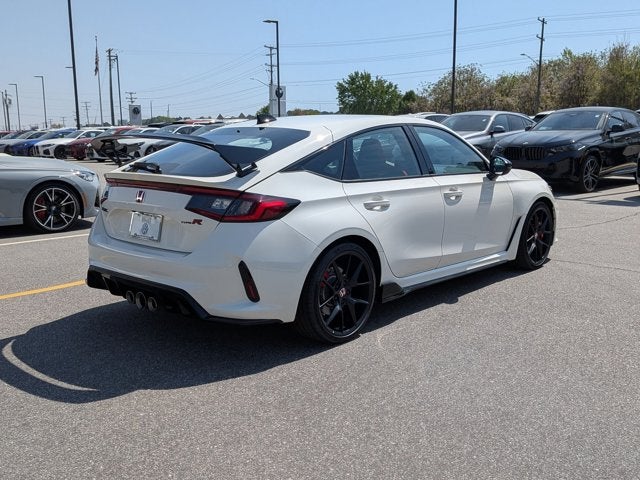CARFAX One-Owner. Clean CARFAX. Championship White 2025 Honda Civic Type R FWD 6-Speed Manual 2.0L I4 Turbocharged DOHC 16V LEV3-ULEV50 315hp 12 Speakers, 4-Wheel Disc Brakes, ABS brakes, Adaptive suspension, Air Conditioning, Alloy wheels, AM/FM radio: SiriusXM, Apple CarPlay/Android Auto, Auto High-beam Headlights, Automatic temperature control, Blind Spot Information (BSI) System warning, Brake assist, Bumpers: body-color, Compass, Delay-off headlights, Driver door bin, Driver vanity mirror, Dual front impact airbags, Dual front side impact airbags, Electronic Stability Control, Exclusively-Designed High-Bolstered Sport Seats, Exterior Parking Camera Rear, Four wheel independent suspension, Front anti-roll bar, Front Bucket Seats, Front Center Armrest, Front dual zone A/C, Front reading lights, Fully automatic headlights, Illuminated entry, Knee airbag, Leather steering wheel, Low tire pressure warning, Navigation System, Occupant sensing airbag, Outside temperature display, Overhead airbag, Overhead console, Panic alarm, Passenger door bin, Passenger vanity mirror, Power door mirrors, Power steering, Power windows, Radio data system, Radio: Bose Premium Sound System with SiriusXM, Rear anti-roll bar, Rear window defroster, Rear window wiper, Remote keyless entry, Security system, Speed control, Speed-sensing steering, Split folding rear seat, Spoiler, Steering wheel mounted audio controls, Suede-Effect Fabric Seating Surfaces, Tachometer, Telescoping steering wheel, Tilt steering wheel, Traction control, Trip computer, Turn signal indicator mirrors, Variably intermittent wipers, Voltmeter, Wheels: 19" x 9.5J Matte Black.
